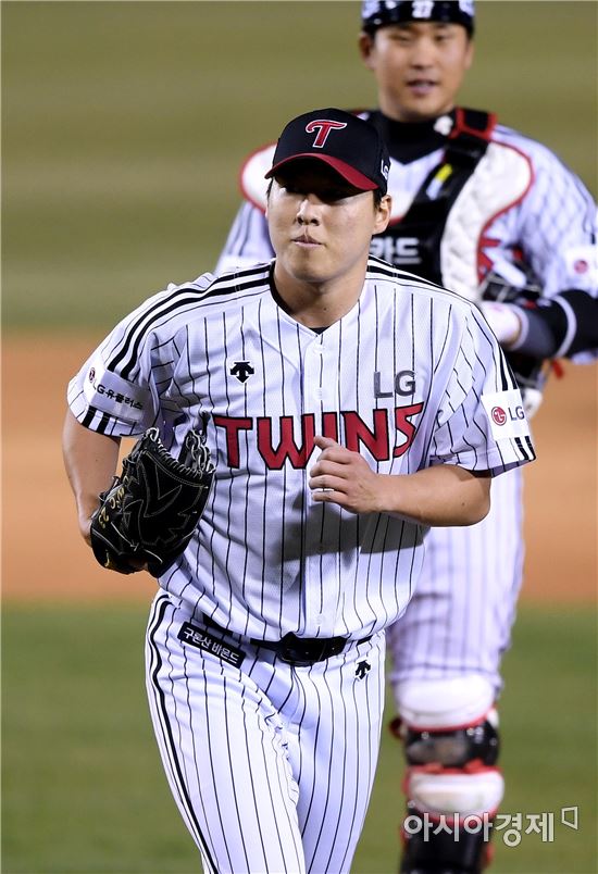 [아시아경제 김현민 기자]프로야구 삼성 라이온즈와 LG 트윈스의 2017 KBO리그 경기가 4일 잠실구장에서 열렸다. LG 선발 차우찬이 7회 초 1사 1루에서 김지용과 교체되고 있다.