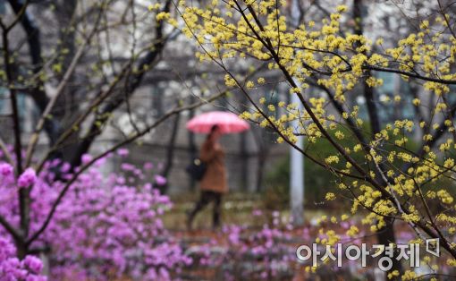 [아시아경제 문호남 수습기자] 식목일이자 봄비가 내린 5일 서울 서대문구 이화여자대학교에서 우산을 쓴 학생들이 봄꽃 아래 발걸음을 옮기고 있다.