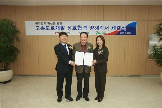 5일 한국도로공사는 카셰어링업체 쏘카, 그린카와 고속도로 개발 및 공유경제 확산을 위한 양해각서(MOU)를 맺었다. 이번 MOU는 관련 인프라를 구축하기 위한 것으로 앞으로 스마트톨링 시스템 도입에 따라 유휴부지를 개발할 때 카셰어링업체가 참여해 대중교통과 공유차량간 환승이 가능해질 전망이다.