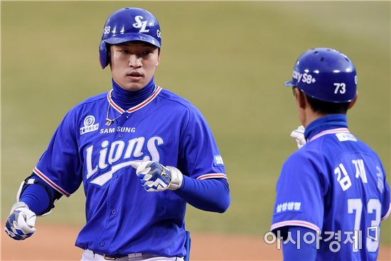 [아시아경제 김현민 기자]프로야구 삼성 라이온즈와 LG 트윈스의 2017 KBO리그 경기가 6일 잠실구장에서 열렸다. 1회초 삼성 선두타자 박해민이 우전 안타를 치고 출루하고 있다.