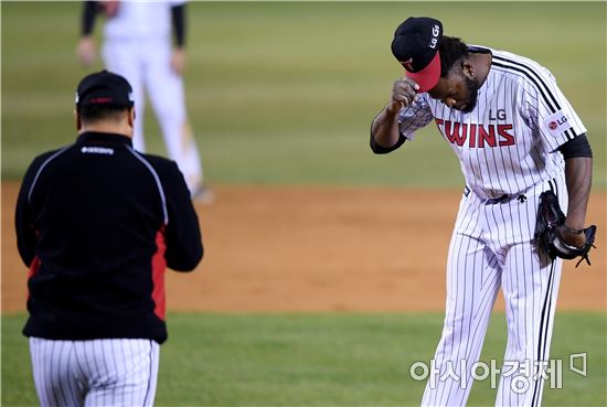 [아시아경제 김현민 기자]프로야구 삼성 라이온즈와 LG 트윈스의 2017 KBO리그 경기가 6일 잠실구장에서 열렸다. LG 선발 소사가 8회초 2사에서 교체를 위해 마운드에 방문하는 강상수 코치를 향해 고개숙여 인사하고 있다.