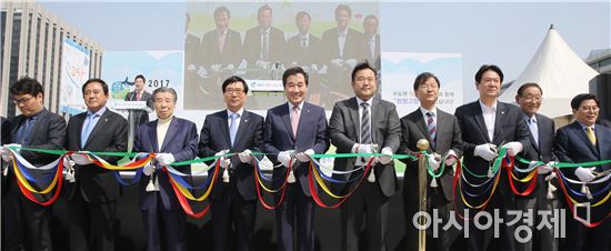 이낙연 전남지사가 7일 오전 서울 광화문광장에서 열린 2017광주·전남귀농귀촌박람회에 참석, 귀농귀촌 정책홍보관과 시·군 부스를 둘러보고 있다. 이번 박람회는 8일까지 서울 광화문광장과 중앙광장(세종문화회관 앞)에서 열린다. 사진제공=전남도