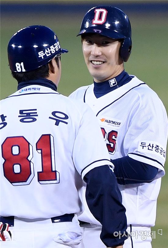 [아시아경제 김현민 기자]프로야구 넥센 히어로즈와 두산 베어스의 2017 KBO리그 경기가 7일 잠실구장에서 열렸다. 2회말 2사 1루에서 두산 김재호가 선취 1타점 2루타를 치고 출루한 뒤 미소 짓고 있다.
