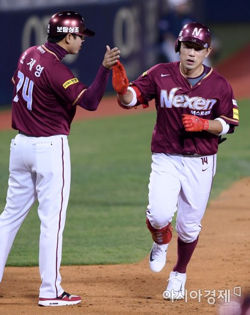 [아시아경제 김현민 기자]프로야구 넥센 히어로즈와 두산 베어스의 2017 KBO리그 경기가 7일 잠실구장에서 열렸다. 4회초 넥센 선두타자 서건창이 두산 선발 니퍼트를 상대로 동점 솔로 홈런을 치고 조재영 코치와 하이파이브하고 있다.