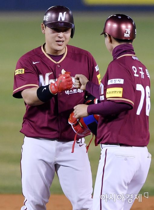 [아시아경제 김현민 기자]프로야구 넥센 히어로즈와 두산 베어스의 2017 KBO리그 경기가 7일 잠실구장에서 열렸다. 4회초 2사 만루에서 넥센 박동원이 역전 2타점 2루타를 치고 오규택 코치와 하이파이브하고 있다.