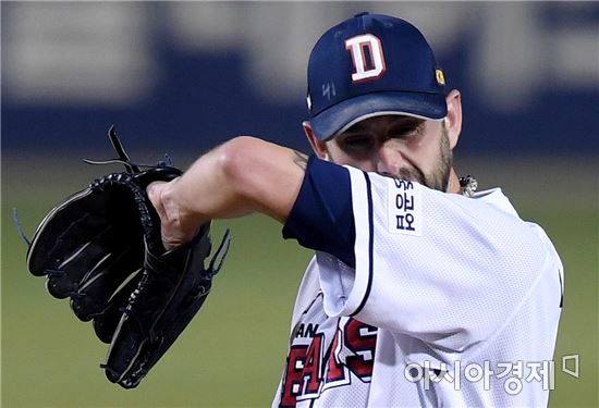 [아시아경제 김현민 기자]프로야구 넥센 히어로즈와 두산 베어스의 2017 KBO리그 경기가 7일 잠실구장에서 열렸다. 두산 선발 니퍼트가 4회초 2사 만루에서 넥센 박동원이 역전 2타점 2루타를 허용한 뒤 아쉬워하고 있다.