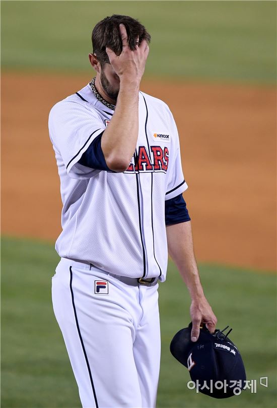 [아시아경제 김현민 기자]프로야구 넥센 히어로즈와 두산 베어스의 2017 KBO리그 경기가 7일 잠실구장에서 열렸다. 두산 선발 니퍼트가 5회초 2사 2루에서 강판되고 있다. 니퍼트는 4.2이닝 6실점으로 부진했다.