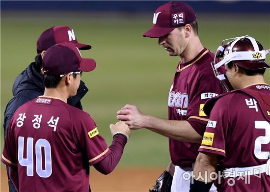 [아시아경제 김현민 기자]프로야구 넥센 히어로즈와 두산 베어스의 2017 KBO리그 경기가 7일 잠실구장에서 열렸다. 넥센 선발투수 밴헤켄이 7회초 1사 1루에서 교체되기 전 마운드를 방문한 장정석 감독과 하이파이브하고 있다.
