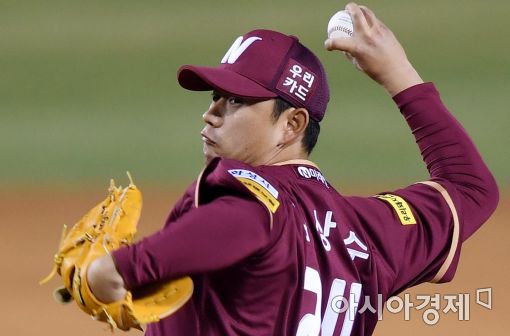 [아시아경제 김현민 기자]프로야구 넥센 히어로즈와 두산 베어스의 2017 KBO리그 경기가 7일 잠실구장에서 열렸다. 넥센 구원투수 김상수가 8회말 역투하고 있다.