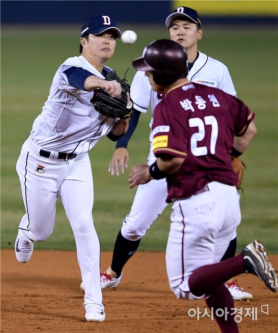[아시아경제 김현민 기자]프로야구 넥센 히어로즈와 두산 베어스의 2017 KBO리그 경기가 7일 잠실구장에서 열렸다. 8회초 1사 1루에서 두산 유격수 류지혁이 넥센 고종욱의 2루 땅볼 때 1루주자 박동원을 포스아웃 시키고 1루로 송구하고 있다. 결과는 병살 아웃.