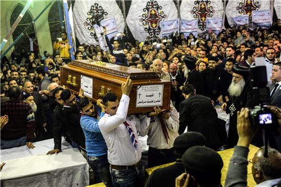 [아시아경제 노미란 기자] 10일(현지시간) 이집트 나일델타 가르비야주의 주도 탄타 시내에 있는 콥트교회에서 발생한 테러로 희생된 이들을 위한 장례식이 거행되고 있다. 이날 이 근방 콥트 교회에서 자행된 두 차례 폭탄 테러로 최소 47명이 숨졌다. (사진출처=EPA연합)