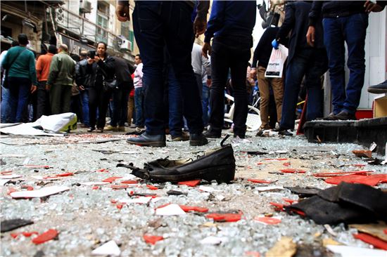[아시아경제 노미란 기자] 10일(현지시간) 이집트 나일델타 가르비야주의 주도 탄타 시내에 있는 콥트교회에서 발생한 테러 현장에 주인을 잃은 신발 한짝이 나뒹굴고 있다. 이날 이 근방 콥트 교회에서 자행된 두 차례 폭탄 테러로 최소 47명이 숨졌다. (사진출처=EPA연합)