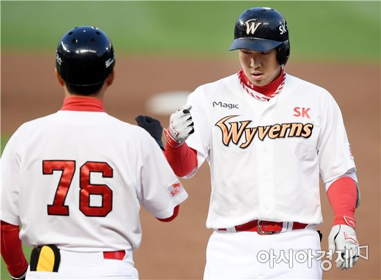 [인천=아시아경제 김현민 기자] 프로야구 롯데 자이언츠와 SK 와이번스의 2017 KBO리그 경기가 11일 인천 SK행복드림구장에서 열렸다. 1회말 2사 2루에서 SK 김동엽이 선취 1타점 적시타를 치고 김인호 코치와 하이파이브하고 있다.