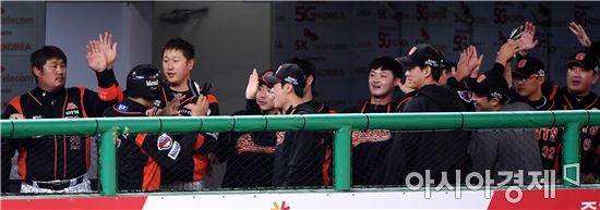 [인천=아시아경제 김현민 기자] 프로야구 롯데 자이언츠와 SK 와이번스의 2017 KBO리그 경기가 11일 인천 SK행복드림구장에서 열렸다. 6회초 2사 1,2루에서 롯데 손아섭의 추가 2타점 2루타 때 득점을 올린 강민호, 이우민이 동료들의 환영을 받고 있다.
