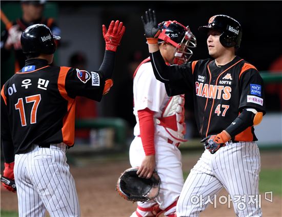 [인천=아시아경제 김현민 기자] 프로야구 롯데 자이언츠와 SK 와이번스의 2017 KBO리그 경기가 11일 인천 SK행복드림구장에서 열렸다. 9회초 무사 1루에서 롯데 강민호가 추가 투런 홈런을 치고 대기 타석의 이우민과 하이파이브하고 있다.