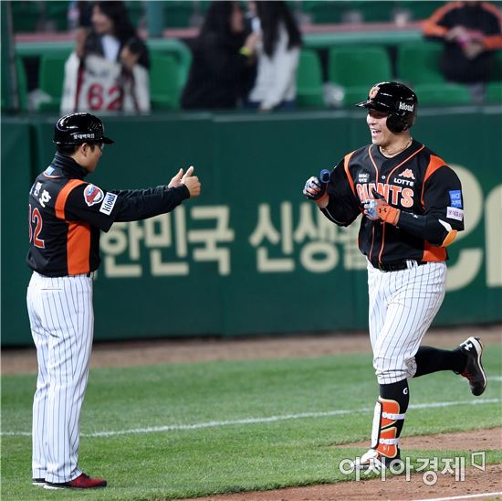 [인천=아시아경제 김현민 기자] 프로야구 롯데 자이언츠와 SK 와이번스의 2017 KBO리그 경기가 11일 인천 SK행복드림구장에서 열렸다. 9회초 무사 1루에서 롯데 강민호가 추가 투런 홈런을 치고 최만호 코치와 하이파이브하고 있다.