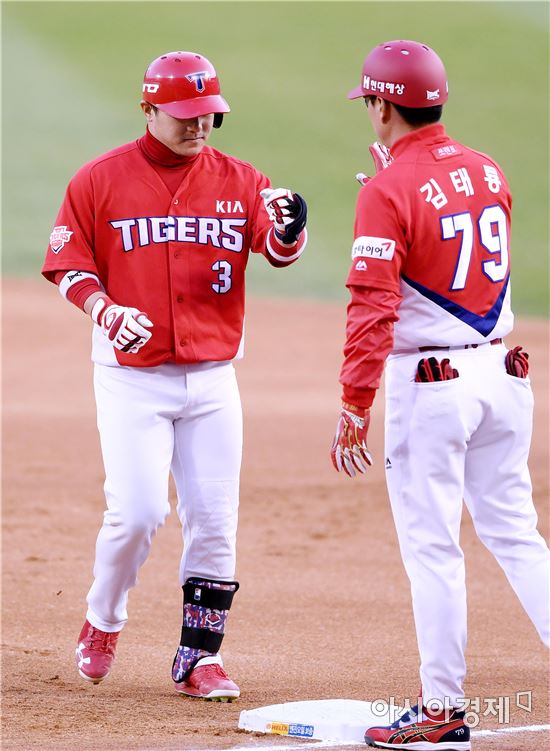[아시아경제 김현민 기자]프로야구 KIA 타이거즈와 두산 베어스의 2017 KBO리그 경기가 12일 잠실구장에서 열렸다. 1회초 1사에서 KIA 김선빈이 중전 안타를 치고 출루한 뒤 김태룡 코치와 하이파이브하고 있다.