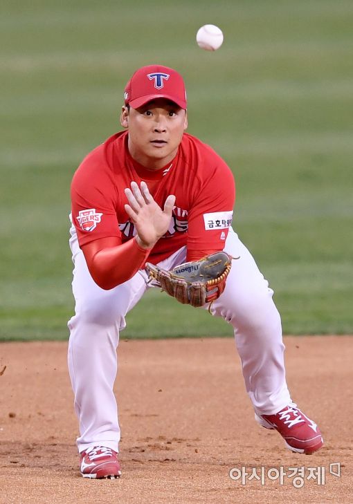 [아시아경제 김현민 기자]프로야구 KIA 타이거즈와 두산 베어스의 2017 KBO리그 경기가 12일 잠실구장에서 열렸다. 1회말 KIA 3루수 김주형이 두산 선두타자 민병헌의 타구를 수비하고 있다.