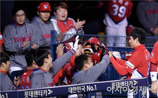 [아시아경제 김현민 기자]프로야구 KIA 타이거즈와 두산 베어스의 2017 KBO리그 경기가 12일 잠실구장에서 열렸다. 6회초 무사 1루에서 역전 2타점 2루타를 친 KIA 신종길이 이닝 종료 뒤 동료들과 하이파이브하고 있다.