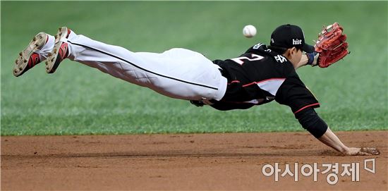 [아시아경제 김현민 기자]프로야구 kt 위즈와 넥센 히어로즈의 2017 KBO리그 경기가 13일 고척돔에서 열렸다. 1회말 kt 유격수 심우준이 넥센 선두타자 이정후의 타구를 잡기 위해 몸을 날리고 있다.