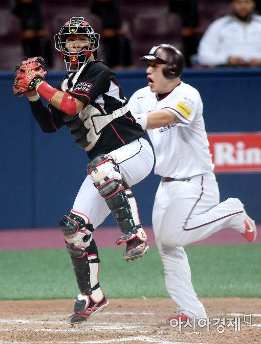 [아시아경제 김현민 기자]프로야구 kt 위즈와 넥센 히어로즈의 2017 KBO리그 경기가 13일 고척돔에서 열렸다. 4회말 1사 만루에서 넥센 윤석민의 1루 땅볼 때 kt 이해창 포수가 3루주자 박동원을 포스아웃 시키려 하고 있다. 하지만 1루에서 먼저 포스아웃이 선언되면서 세이프가 됐다.