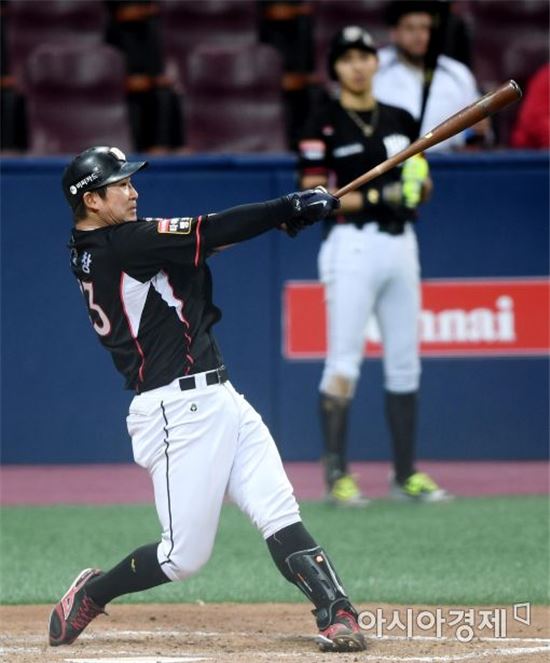 [아시아경제 김현민 기자]프로야구 kt 위즈와 넥센 히어로즈의 2017 KBO리그 경기가 13일 고척돔에서 열렸다. 5회초 무사 2루에서 kt 이해창이 넥센 선발 밴헤켄을 상대로 좌월 투런 홈런을 치고 있다.