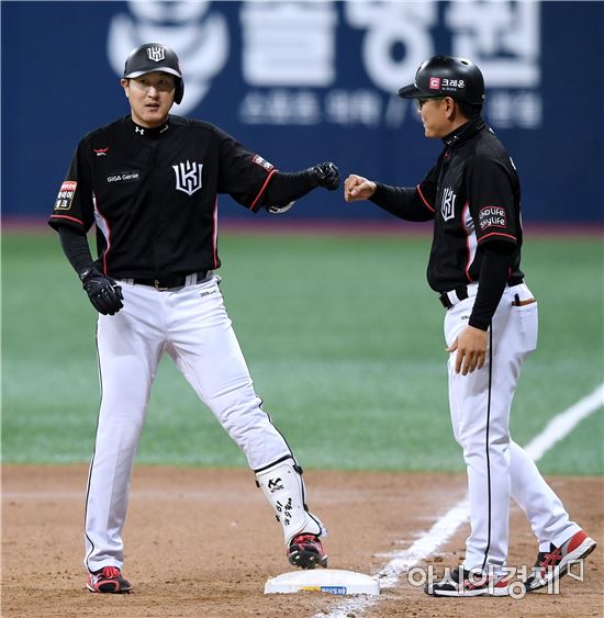 [아시아경제 김현민 기자]프로야구 kt 위즈와 넥센 히어로즈의 2017 KBO리그 경기가 13일 고척돔에서 열렸다. 9회초 2사 1,2루에서 kt 유한준이 동점 1타점 적시타를 치고 채종범 코치와 하이파이브하고 있다.