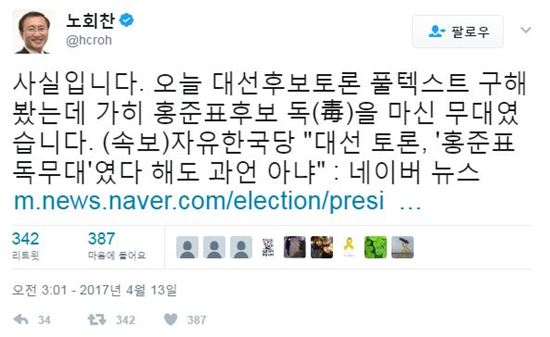 13일 노회찬 원내대표는 "오늘 대선후보토론 풀텍스트를 구해 봤다."며 자신의 SNS에 "자유한국당 대선 토론, 홍준표 독무대였다 해도 과언 아냐"라는 제목의 기사를 공유하면서 이같이 밝혔다.
