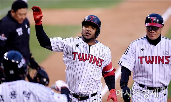 [아시아경제 김현민 기자]프로야구 kt 위즈와 LG 트윈스의 2017 KBO리그 경기가 14일 잠실구장에서 열렸다. 1회말 2사 2루에서 LG 히메네스가 kt 선발 정대현을 상대로 역전 투런 홈런을 치고 선행주자 박용택과 하이파이브하고 있다.