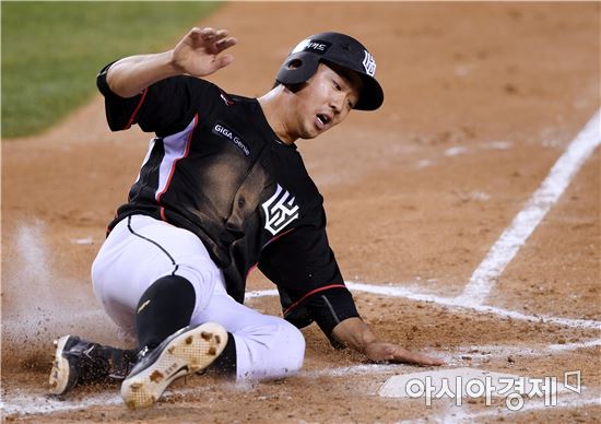[아시아경제 김현민 기자]프로야구 kt 위즈와 LG 트윈스의 2017 KBO리그 경기가 14일 잠실구장에서 열렸다. 3회초 2사 2루에서 kt 유한준의 동점 1타점 적시타 때 2루주자 전민수가 득점하고 있다.