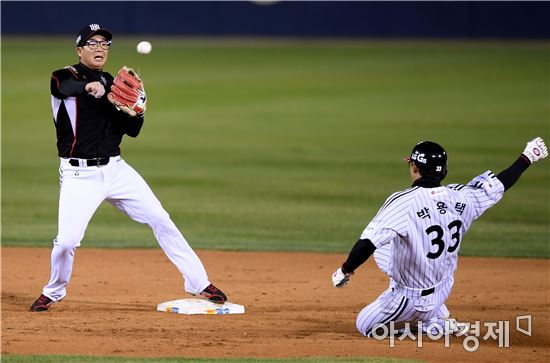 [아시아경제 김현민 기자]프로야구 kt 위즈와 LG 트윈스의 2017 KBO리그 경기가 14일 잠실구장에서 열렸다. 4회말 무사 1루에서 kt 2루수 김연훈이 LG 히메네스의 투수 땅볼 때 1루주자 박용택을 포스아웃 시키고 1루로 송구하고 있다. 결과는 병살 아웃