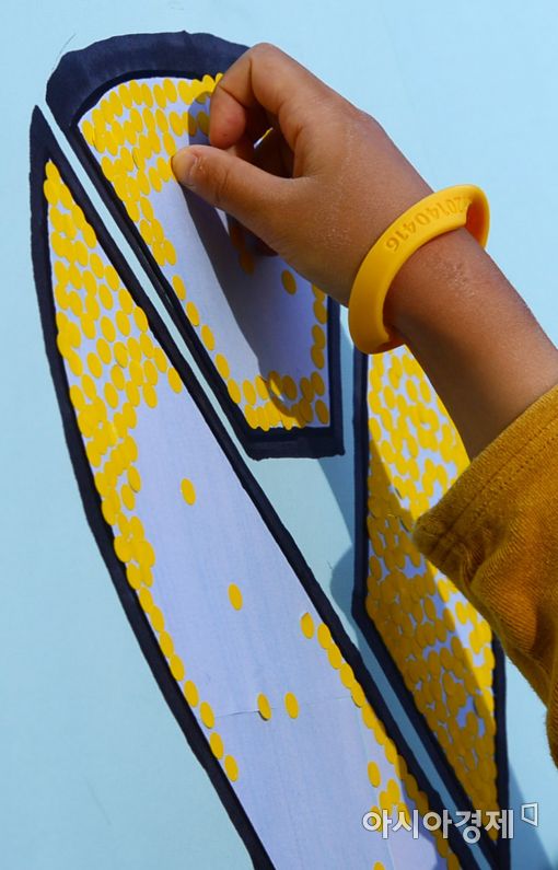 [아시아경제 문호남 수습기자] 세월호 참사 3주기를 하루 앞둔 15일 서울 종로구 광화문 광장에서 한 시민이 추모의 노란 리본 피켓에 스티커를 부착하고 있다.