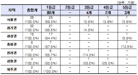 1등급 기관을 권역별로 보면 서울권이 28곳으로 가장 많았다. 다음으로 경기권(22곳), 경상권(18곳), 충청권(8곳), 전라권(7곳), 강원권(4곳), 제주권(2곳) 등의 순으로 조사됐다. 지역별로 1등급 기관이 대체로 고르게 분포된 가운데 강원도 권역의 경우엔 평가대상 4기관 중 1등급은 2곳으로 1등급 기관 비율이 가장 낮게 나타났다.