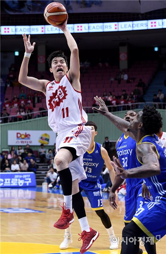 [아시아경제 김현민 기자]프로농구 서울 삼성과 고양 오리온의 2016-2017 시즌 4강 플레이오프 4차전이 17일 잠실실내체육관에서 열렸다. 오리온 허일영이 상대 수비를 뚫고 공격하고 있다.