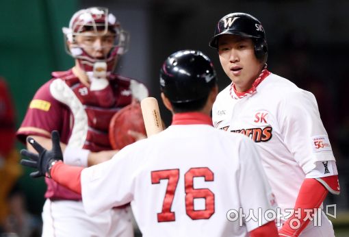 [인천=아시아경제 김현민 기자]프로야구 넥센 히어로즈와 SK와이번스의 2017 KBO리그 경기가 18일 인천 SK행복드림구장에서 열렸다. 5회말 2사 1루에서 SK 김동엽이 넥센 선발투수 오주원을 상대로 추가 투런 홈런을 치고 김인호 코치와 기뻐하고 있다.