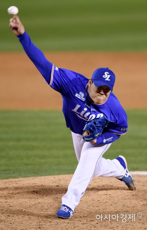 [아시아경제 김현민 기자]프로야구 삼성 라이온즈와 두산 베어스의 2017 KBO리그 경기가 19일 잠실구장에서 열렸다. 7회말 삼성 구원투수 김승현이 역투하고 있다.