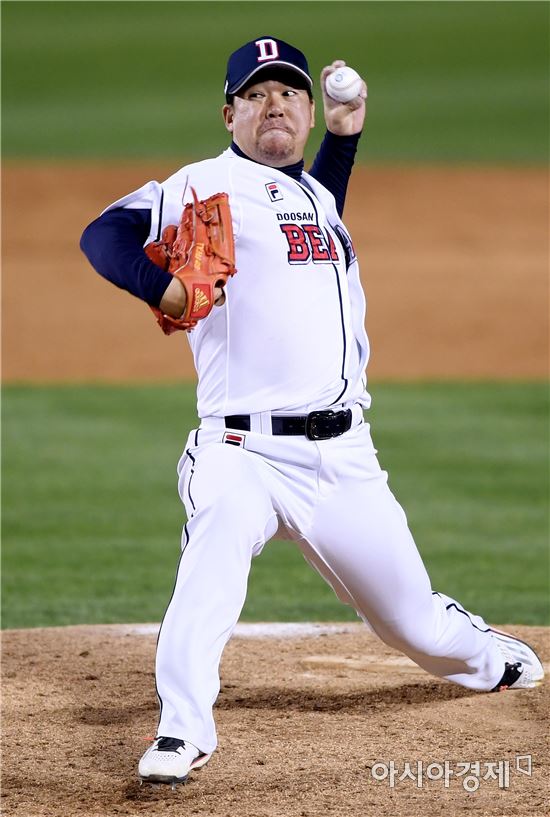 [아시아경제 김현민 기자]프로야구 삼성 라이온즈와 두산 베어스의 2017 KBO리그 경기가 19일 잠실구장에서 열렸다. 8회초 두산 구원투수 이현승이 역투하고 있다.