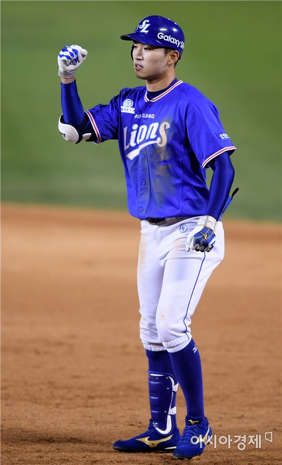 [아시아경제 김현민 기자]프로야구 삼성 라이온즈와 두산 베어스의 2017 KBO리그 경기가 19일 잠실구장에서 열렸다. 8회초 2사 1,3루에서 삼성 박해민이 동점 1타점 적시타를 치고 환호하고 있다.