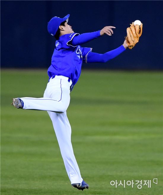 [아시아경제 김현민 기자]프로야구 삼성 라이온즈와 두산 베어스의 2017 KBO리그 경기가 19일 잠실구장에서 열렸다. 8회말 2사에서 삼성 유격수 강한울이 두산 오재일의 타구를 잡아내고 있다.