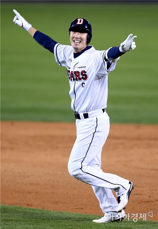 [아시아경제 김현민 기자]프로야구 삼성 라이온즈와 두산 베어스의 2017 KBO리그 경기가 19일 잠실구장에서 열렸다. 9회말 2사 2루에서 두산 김재호가 끝내기 안타를 치고 환호하고 있다. 두산의 2-1 승리.
