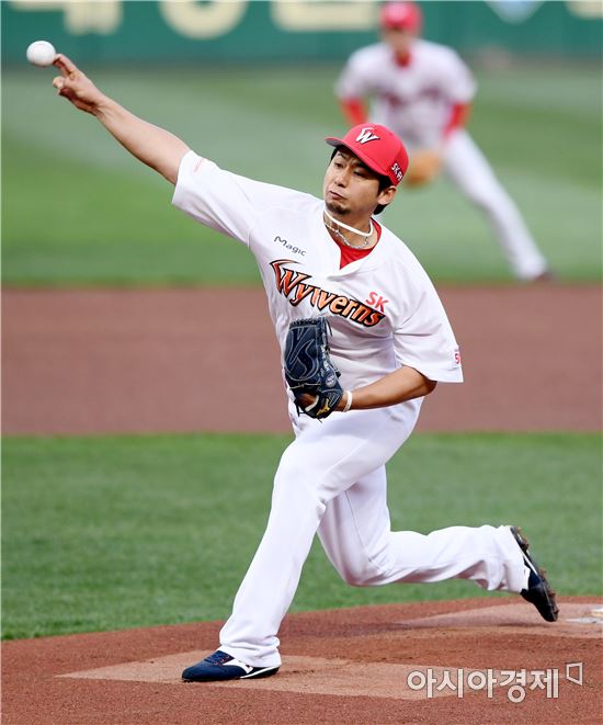 [인천=아시아경제 김현민 기자]프로야구 넥센 히어로즈와 SK와이번스의 2017 KBO리그 경기가 20일 인천 SK행복드림구장에서 열렸다. SK 선발투수 윤희상이 역투하고 있다.