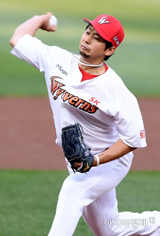 [인천=아시아경제 김현민 기자]프로야구 넥센 히어로즈와 SK와이번스의 2017 KBO리그 경기가 20일 인천 SK행복드림구장에서 열렸다. SK 선발투수 윤희상이 역투하고 있다.