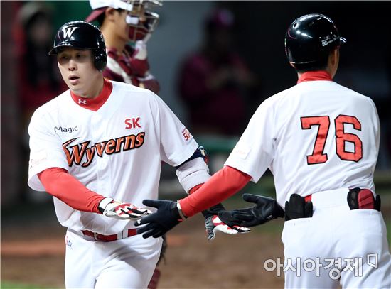 [인천=아시아경제 김현민 기자]프로야구 넥센 히어로즈와 SK와이번스의 2017 KBO리그 경기가 20일 인천 SK행복드림구장에서 열렸다. 7회말 2사에서 SK 이홍구가 넥센 이보근을 상대로 솔로 홈런을 치고 김인호 코치의 환영을 받고 있다.