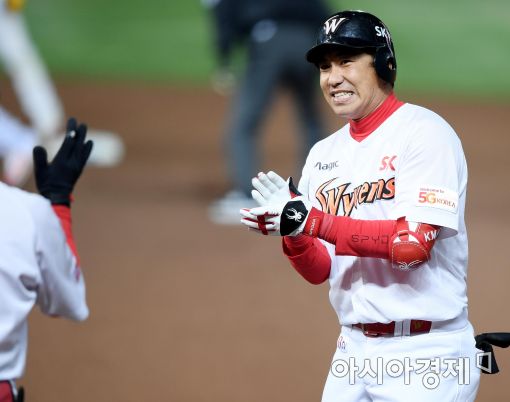 [인천=아시아경제 김현민 기자]프로야구 넥센 히어로즈와 SK와이번스의 2017 KBO리그 경기가 20일 인천 SK행복드림구장에서 열렸다. 7회말 2사에서 1,3루에서 SK 김강민이 동점 1타점 적시타를 치고 박수치며 기뻐하고 있다.