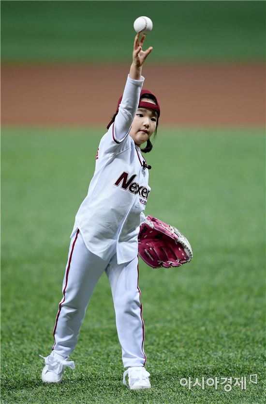[아시아경제 김현민 기자]프로야구 롯데 자이언츠와 넥센 히어로즈의 2017 KBO리그 경기가 21일 서울 고척돔에서 열렸다. 배우 이범수의 딸 이소을 양이 시구하고 있다.