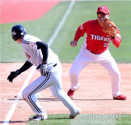 [아시아경제 김현민 기자]프로야구 KIA 타이거즈와 LG 트윈스의 2017 KBO리그 경기가 23일 잠실구장에서 열렸다. 3회말 1사 1,3루에서 KIA 3루수 이범호가 LG 정상호 타석 때 포수 견제에 걸린 3루주자 양석환을 쫓고 있다.