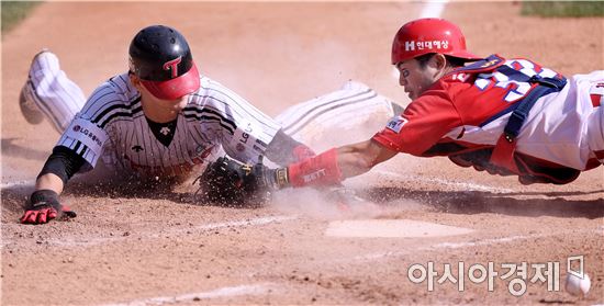 [아시아경제 김현민 기자]프로야구 KIA 타이거즈와 LG 트윈스의 2017 KBO리그 경기가 23일 잠실구장에서 열렸다. 4회말 1사 3루에서 LG 박용택의 2루수 앞 땅볼 때 3루주자 이형종이 홈으로 쇄도하고 있다. KIA 포수는 김민식, 결과는 세이프.