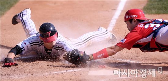 [아시아경제 김현민 기자]프로야구 KIA 타이거즈와 LG 트윈스의 2017 KBO리그 경기가 23일 잠실구장에서 열렸다. 4회말 1사 3루에서 LG 박용택의 2루수 앞 땅볼 때 3루주자 이형종이 홈으로 쇄도하고 있다. KIA 포수는 김민식, 결과는 세이프.