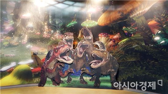▲공연장은 1,432㎡ 규모로 가로42m 세로9m의 월드 스크린의 3D영상과 대형 공룡 로봇이 함께 공룡쇼를 펼쳐 우리나라 최초로 4D멀티미디어 쇼 공연으로 관광객의 오감을 만족시키는 최고의 장소가 될 것으로 기대하고 있다.