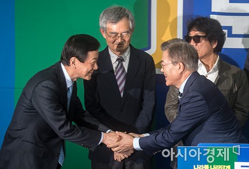 [아시아경제 윤동주 기자] 문재인 더불어민주당 대선후보가 24일 서울 여의도 당사에서 '서울역사문화벨트조성공약'·'광화문대통령공약' 기획위원회 위원회 출범 기자회견을 마친 후 진영 의원과 인사를 나누고 있다.